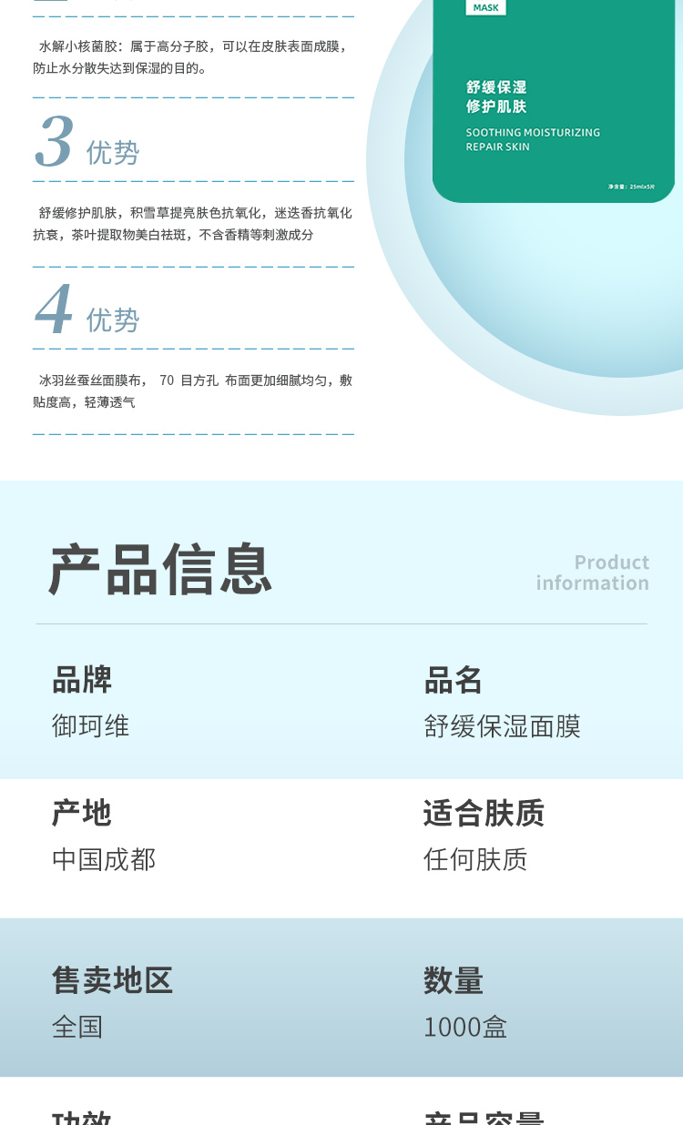 面膜批发厂家 保湿补水 修护肌肤 舒缓润肤 25ML*5片 任何肤质 御珂维